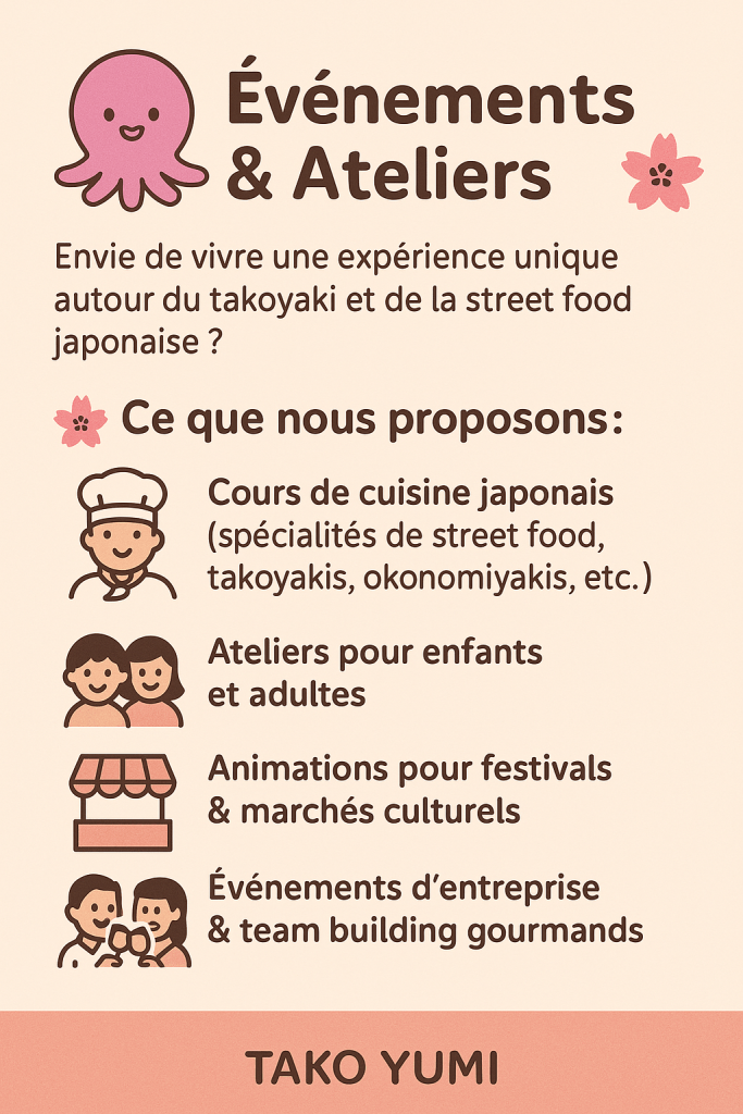 Envie de vivre une expérience unique autour du takoyaki et de la street food japonaise ? Chez Tako Yumi, on ne fait pas que régaler vos papilles, on crée aussi du lien ! Que vous soyez une entreprise en quête de team building, un festival à la recherche d’une animation culinaire originale, ou simplement curieux d’apprendre à rouler les fameuses boules au poulpe, nos événements sont faits pour vous.