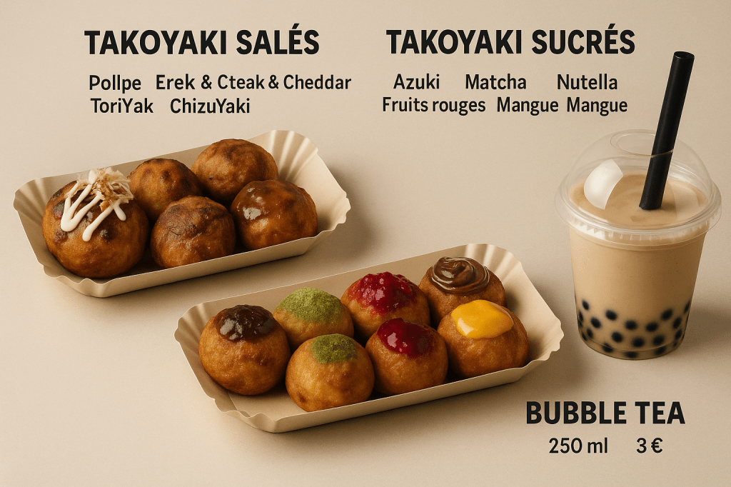 1 bubble tea + takoyakis salés + takoyakis sucrés